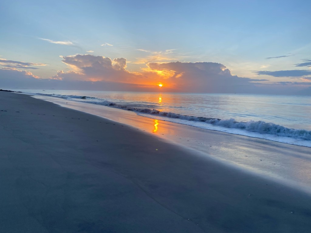 I walk near the waves where the sand is slightly more firm. I watch the sunrise each morning, I note where the fishing boats are (so that I don’t swim there later..I cannot stand the thought of fish swimming around me), I listen to the waves crashing. Then when I get to the rocks at the end, I turn around. While I have my morning zen, Harold usually runs around like a maniac. He chases birds, goes for a swim, sprints directly at other morning dog walkers (which is terrifying to them but he just sniffs and then sprints directly back to me), he rolls in the sand, pounces near hermit crabs. He is living his best life.